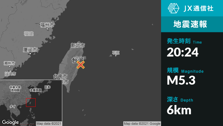 7月07日 20:24頃、台湾のHualien Cityから南南東14kmの地点でM5.3の地震がありました。