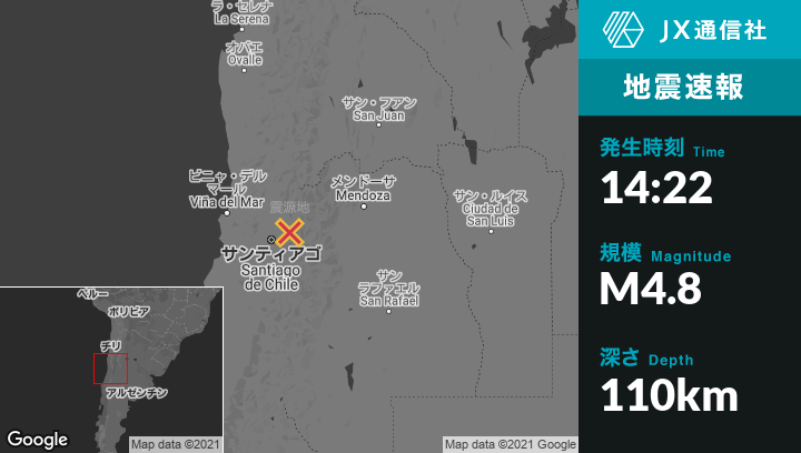 7月14日 14:22頃、チリのChicureo Abajoから東北東32kmの地点でM4.8の地震がありました。