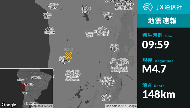 7月17日 09:59頃、チリのCalamaから北北東89kmの地点でM4.7の地震がありました。