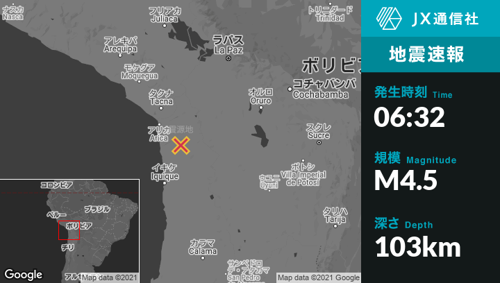 7月19日 06:32頃、チリのAricaから南東90kmの地点でM4.5の地震がありました。