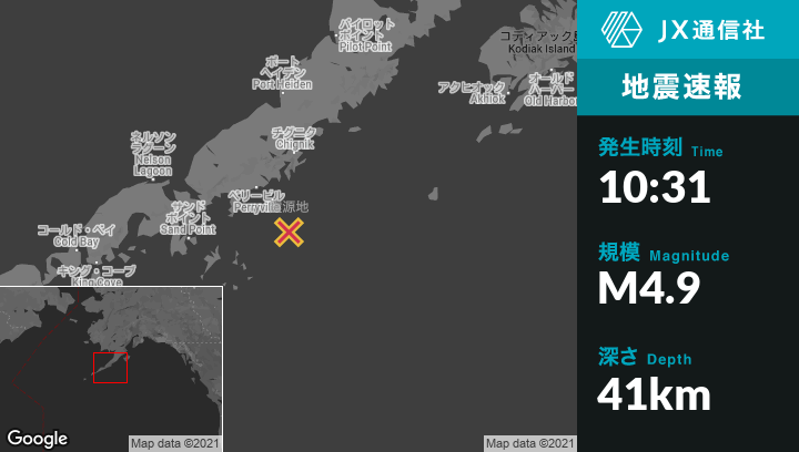 | 震源地 | アラスカのPerryvilleから南東62kmの地点 |