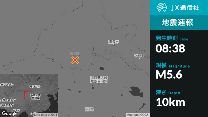 8月26日 08:38頃、中国のLaojunmiaoから西南西212kmの地点でM5.6の地震がありました。