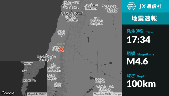 8月26日 17:34頃、チリのParralから南東23kmの地点でM4.6の地震がありました。
