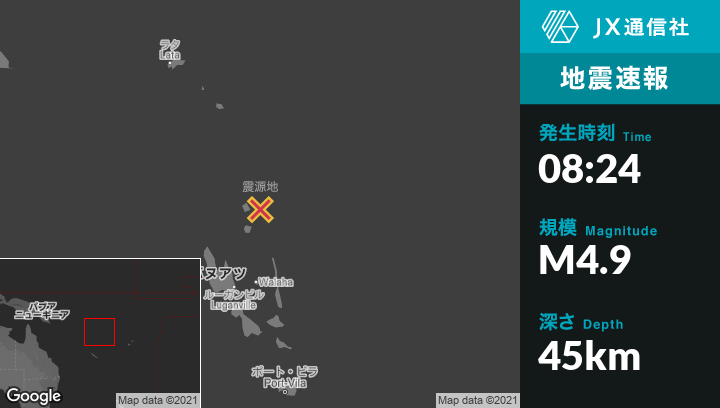 8月31日 08:24頃、バヌアツのSolaから東北東28kmの地点でM4.9の地震がありました。