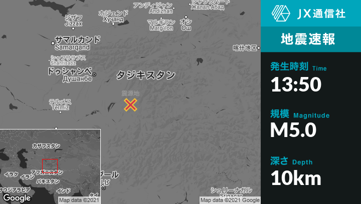 9月02日 13:50頃、アフガニスタンのFayzabadから北北西57kmの地点でM5.0の地震がありました。
