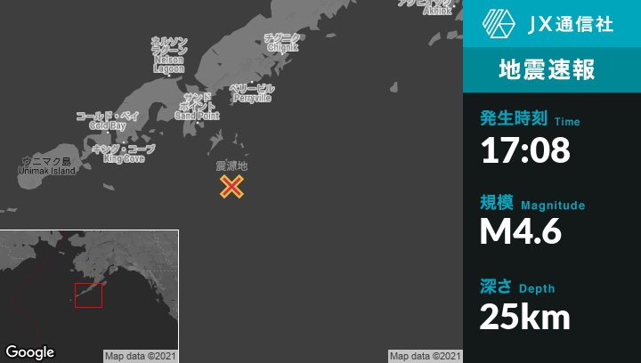 | 震源地 | アラスカのSand Pointから南南東106kmの地点 |
