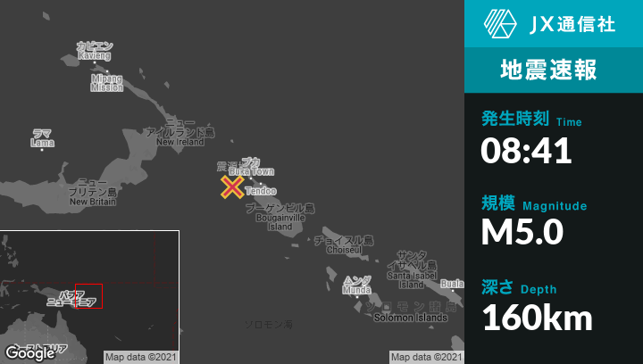9月05日 08:41頃、パプアニューギニアのPangunaから西北西167kmの地点でM5.0の地震がありました。