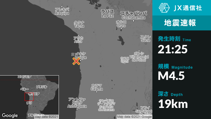 9月05日 21:25頃、チリのIquiqueから西33kmの地点でM4.5の地震がありました。
