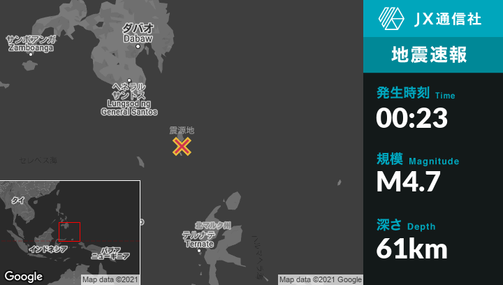 | 震源地 | フィリピンのSaranganiから南東203kmの地点 |