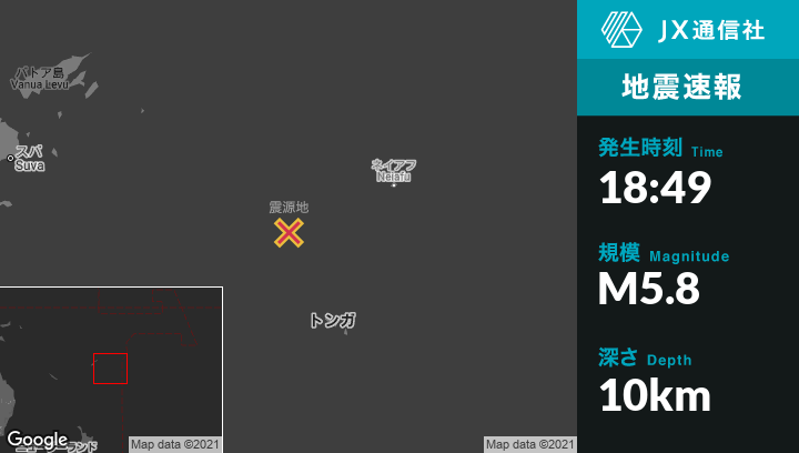9月07日 18:49頃、トンガのPangaiから西北西184kmの地点でM5.8の地震がありました。
