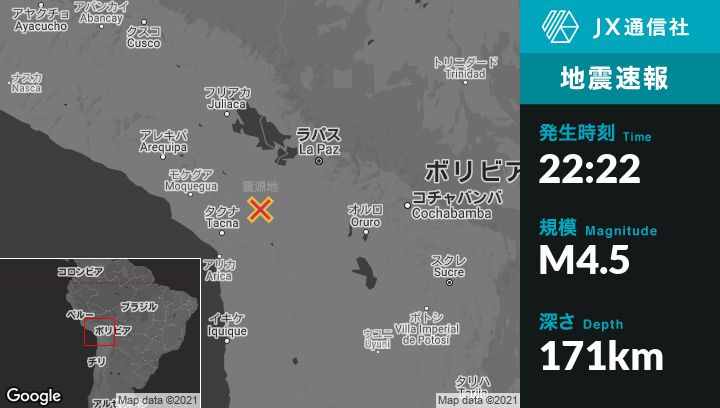 9月07日 22:22頃、ペルーのEstiqueから東北東67kmの地点でM4.5の地震がありました。