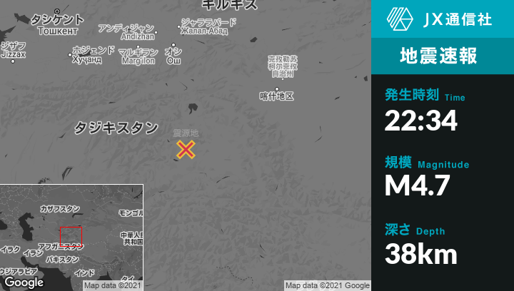 9月07日 22:34頃、タジキスタンのMurghobから西69kmの地点でM4.7の地震がありました。
