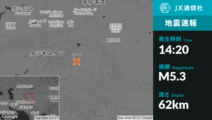9月08日 14:20頃、タジキスタンのMurghobから西62kmの地点でM5.3の地震がありました。