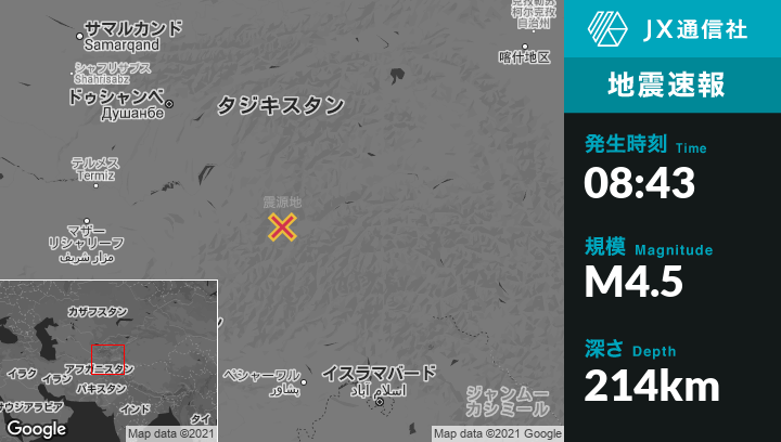9月10日 08:43頃、アフガニスタンのJurmから南東29kmの地点でM4.5の地震がありました。