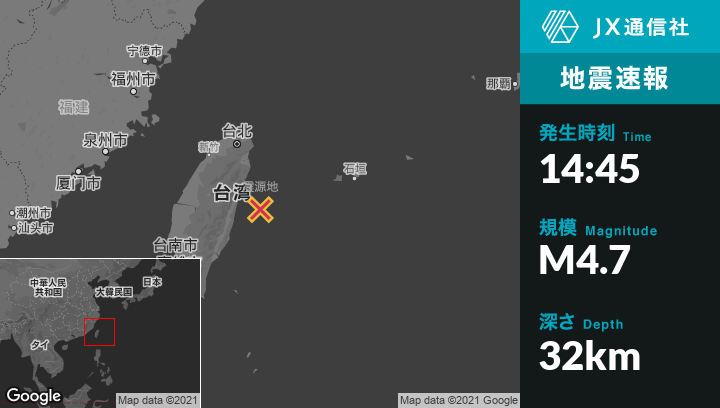 9月10日 14:45頃、台湾のHualien Cityから東南東51kmの地点でM4.7の地震がありました。