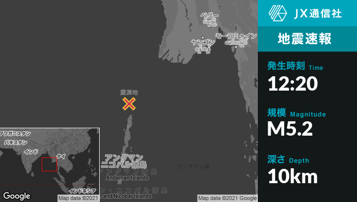 9月11日 12:20頃、インドのBamboo Flatから北270kmの地点でM5.2の地震がありました。