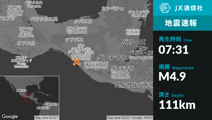 9月16日 07:31頃、メキシコのNuevo Milenio Valdiviaから北西3kmの地点でM4.9の地震がありました。