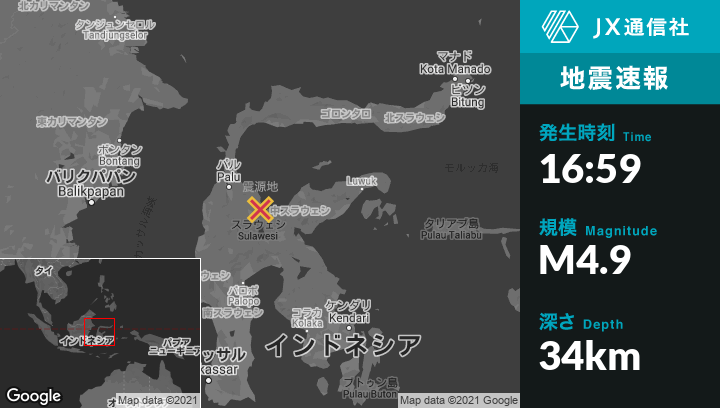 9月16日 16:59頃、インドネシアのPosoから北西24kmの地点でM4.9の地震がありました。