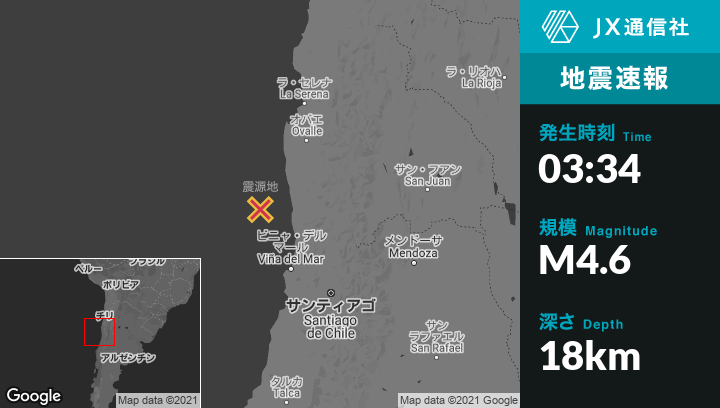 9月17日 03:34頃、チリのIllapelから西101kmの地点でM4.6の地震がありました。