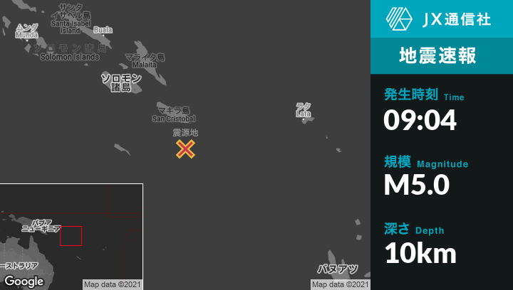 9月17日 09:04頃、ソロモン諸島のKirakiraから南南東117kmの地点でM5.0の地震がありました。
