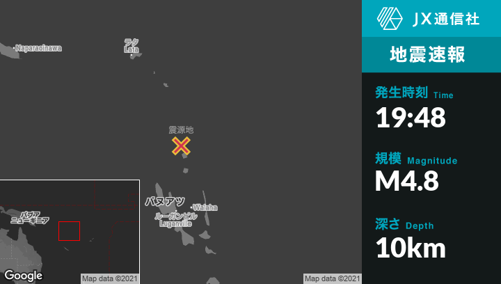 9月17日 19:48頃、バヌアツのSolaから北北西55kmの地点でM4.8の地震がありました。