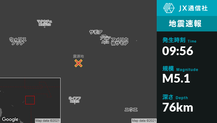9月18日 09:56頃、トンガのHihifoから北北東28kmの地点でM5.1の地震がありました。