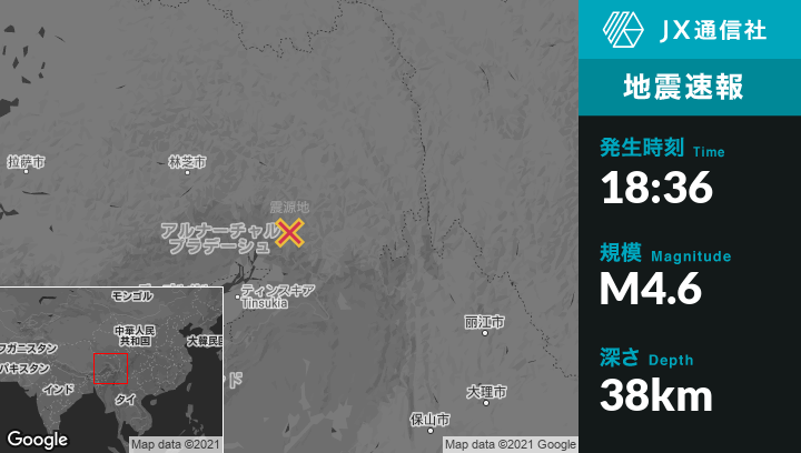 9月19日 18:36頃、インドのHayuliangから北北西72kmの地点でM4.6の地震がありました。
