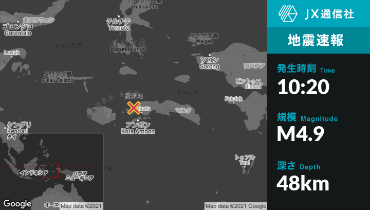 9月21日 10:20頃、インドネシアのAmbonから北北西77kmの地点でM4.9の地震がありました。