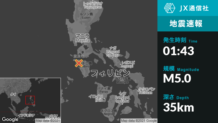 | 震源地 | フィリピンのCabacaoから東5kmの地点 |