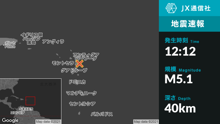 9月25日 12:12頃、グアドループのAnse-Bertrandから北東53kmの地点でM5.1の地震がありました。