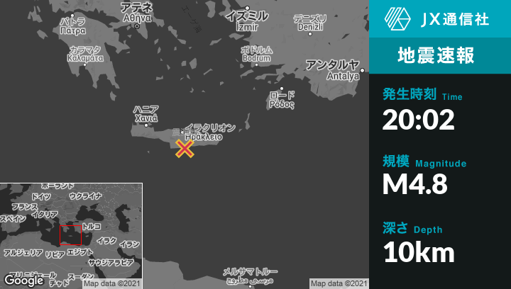 9月27日 20:02頃、ギリシャのPýrgosから東北東5kmの地点でM4.8の地震がありました。