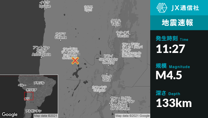 | 震源地 | チリのSan Pedro de Atacamaから南南東101kmの地点 |