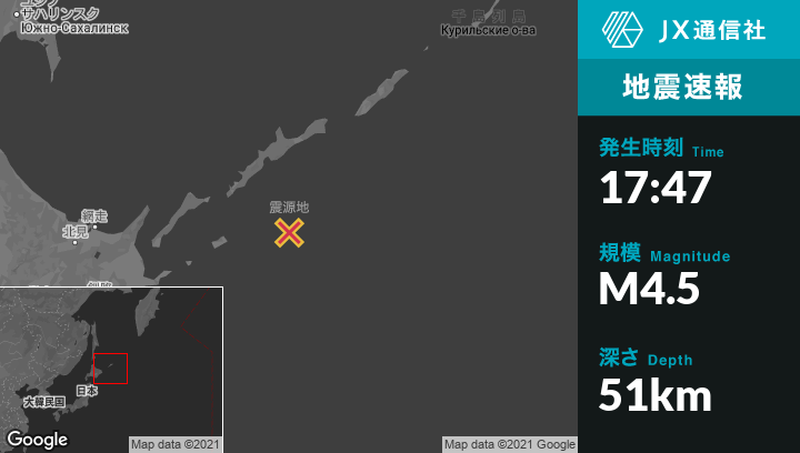10月30日 17:47頃、ロシアのShikotanから東北東114kmの地点でM4.5の地震がありました。