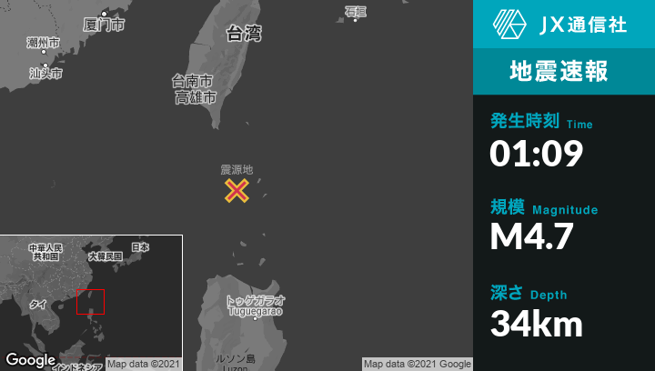 10月31日 01:09頃、フィリピンのBascoから西北西74kmの地点でM4.7の地震がありました。