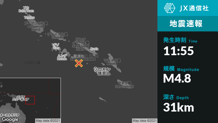 10月31日 11:55頃、ソロモン諸島のBualaから南西148kmの地点でM4.8の地震がありました。
