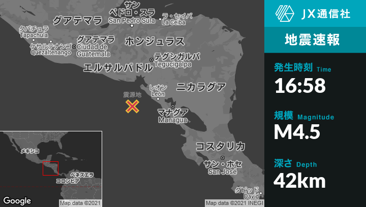 | 震源地 | ニカラグアのJiquililloから南西82kmの地点 |