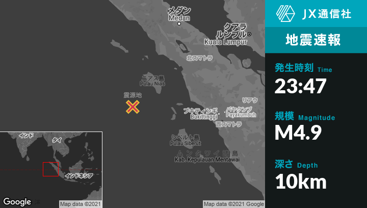 | 震源地 | インドネシアのSinabangから南262kmの地点 |