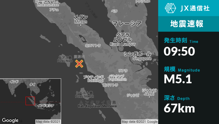 | 震源地 | インドネシアのSibolgaから南南西94kmの地点 |
