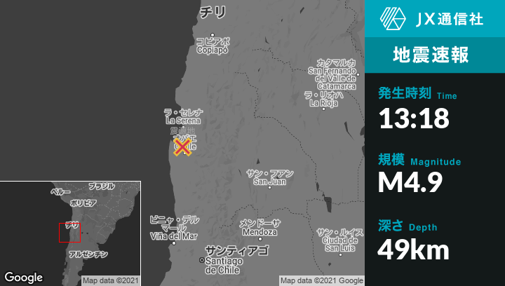 11月04日 13:18頃、チリのOvalleから北北西31kmの地点でM4.9の地震がありました。