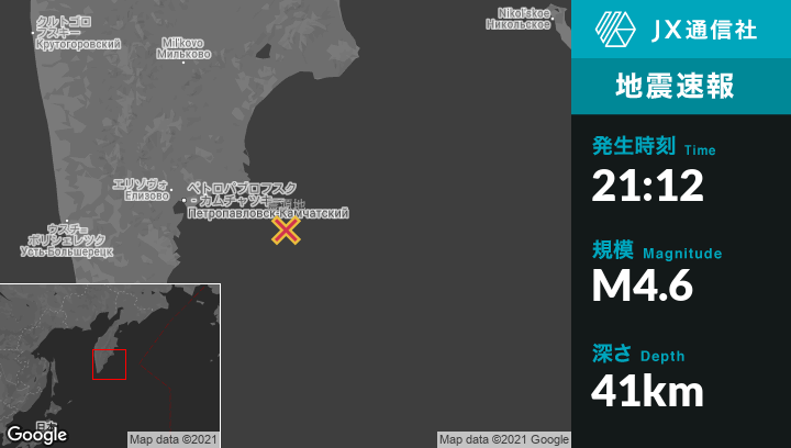 | 震源地 | ロシアのPetropavlovsk-Kamchatskyから東南東140kmの地点 |