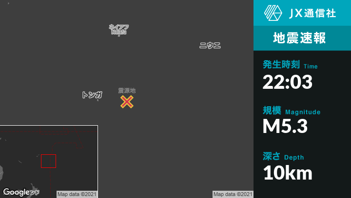 | 震源地 | トンガの‘Ohonuaから東136kmの地点 |