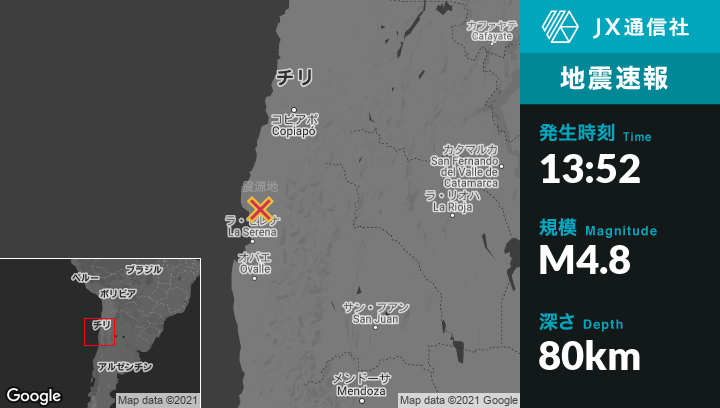 11月08日 13:52頃、チリのVallenarから南南西75kmの地点でM4.8の地震がありました。