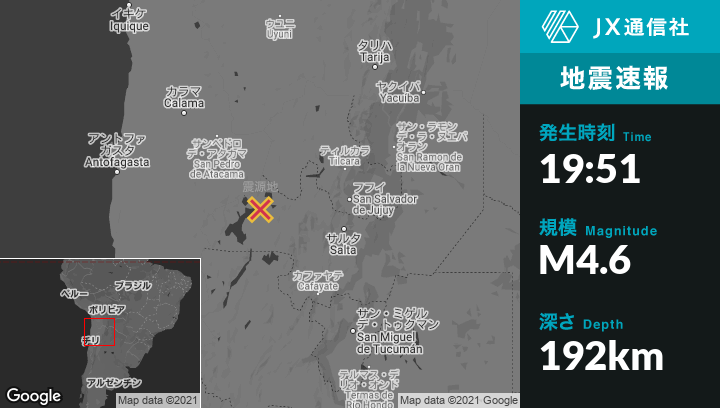 | 震源地 | アルゼンチンのSan Antonio de los Cobresから西96kmの地点 |