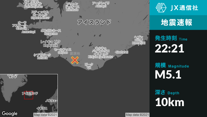 | 震源地 | アイスランドのVestmannaeyjarから北北東40kmの地点 |
