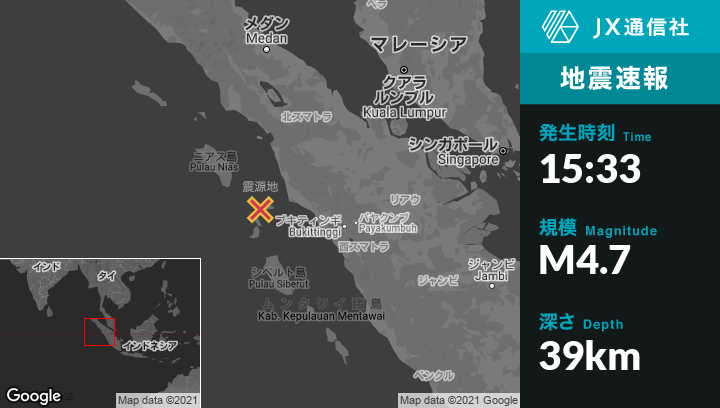 | 震源地 | インドネシアのPadangsidempuanから南南西155kmの地点 |