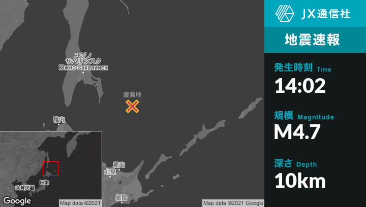 11月13日 14:02頃、ロシアのKorsakovから東南東171kmの地点でM4.7の地震がありました。