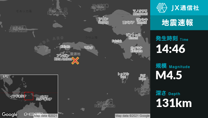 | 震源地 | インドネシアのAmahaiから南南東87kmの地点 |