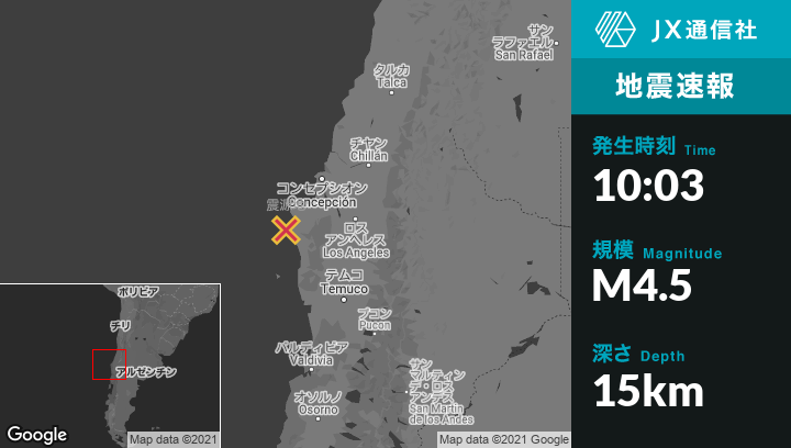 11月15日 10:03頃、チリのLebuから北西11kmの地点でM4.5の地震がありました。