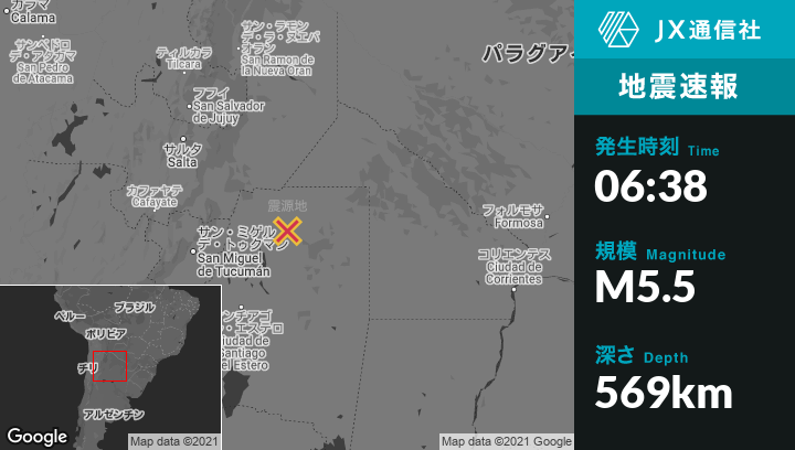 | 震源地 | アルゼンチンのCampo Galloから西北西56kmの地点 |
