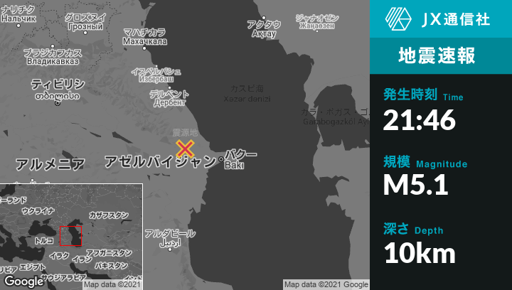 11月20日 21:46頃、アゼルバイジャンのShamakhiから北東16kmの地点でM5.1の地震がありました。